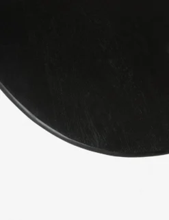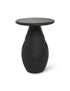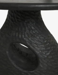 This hand-carved mango wood side table offers lots of textural appeal and stylishly displays its artisan craftsmanship. Its flowing design and a carved window through the base visually balance the blackened woodgrain finish. Style this end table as a grounding element for a moody decor.