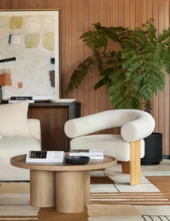 With its pedestal base, subtly recessed tabletop, and ash veneer, this Delta Round Coffee Table marries pared-down design with elevated details. The rich woodgrain highlights the natural finish and three clustered columns complement the slim-lined round top. We love curating this wood coffee table with sculptural and tactile accents.