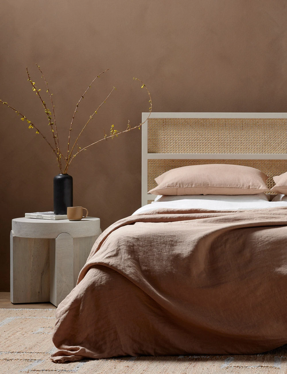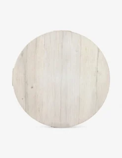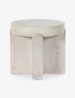 A sun-bleached oak veneer offers refined tones to the rustic splendor of this chunky wood side table. The round top is fashioned to fit on a cross-style base, grounding this bedside or end table with a sturdy, sculptural silhouette.