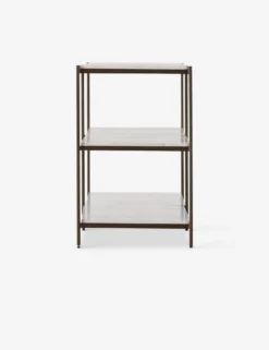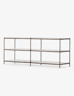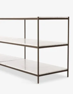 Add some polish to your edit with the Evander console table. White marble shelving offers a luxe touch to the antique brass frame featuring airy, open shelving. This console table is made for vignettes—style with plenty of greenery and other natural touches to bring a pleasing textural contrast to the sleek mixed-material design.