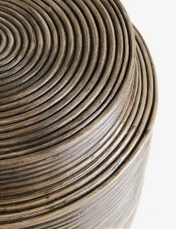 A stunning transitional living room side table, this round accent table is completely wrapped in coiled rattan with a sloping detail at the top for added dimension.