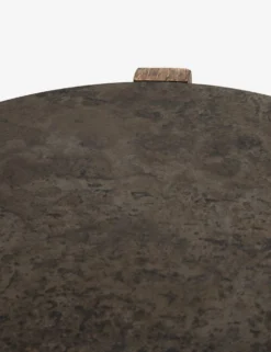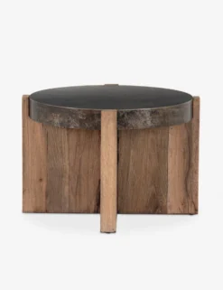 A distinctly modern side table with plenty of character. Designed with a distressed iron drum table, resting in an oak wood frame, this round living room side table mixes organic and industrial materials with effortless brilliance.