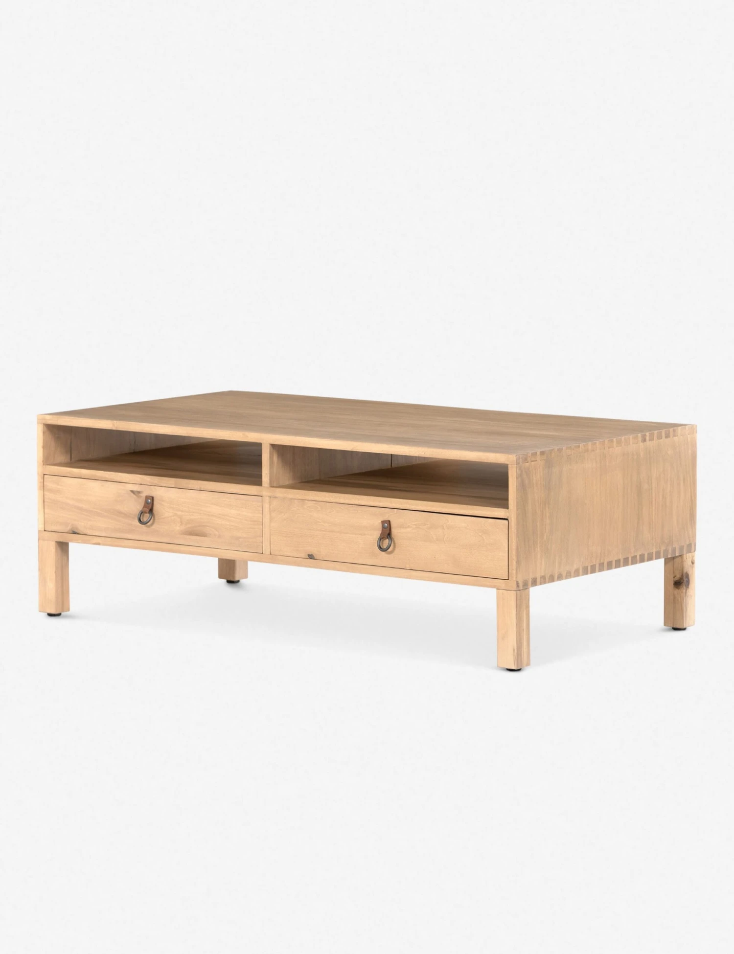 Simply inspired, this solid dry-washed poplar coffee table combines clean lines with dovetail joints in a Shaker-inspired design. This wood coffee table is finished in a light neutral tone and fitted with iron and leather hardware and push-through-drawers for dynamic storage in a versatile, understated style.