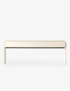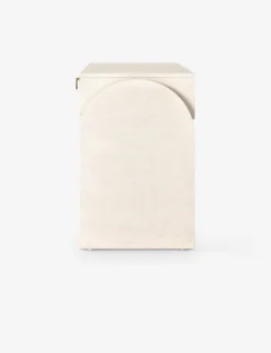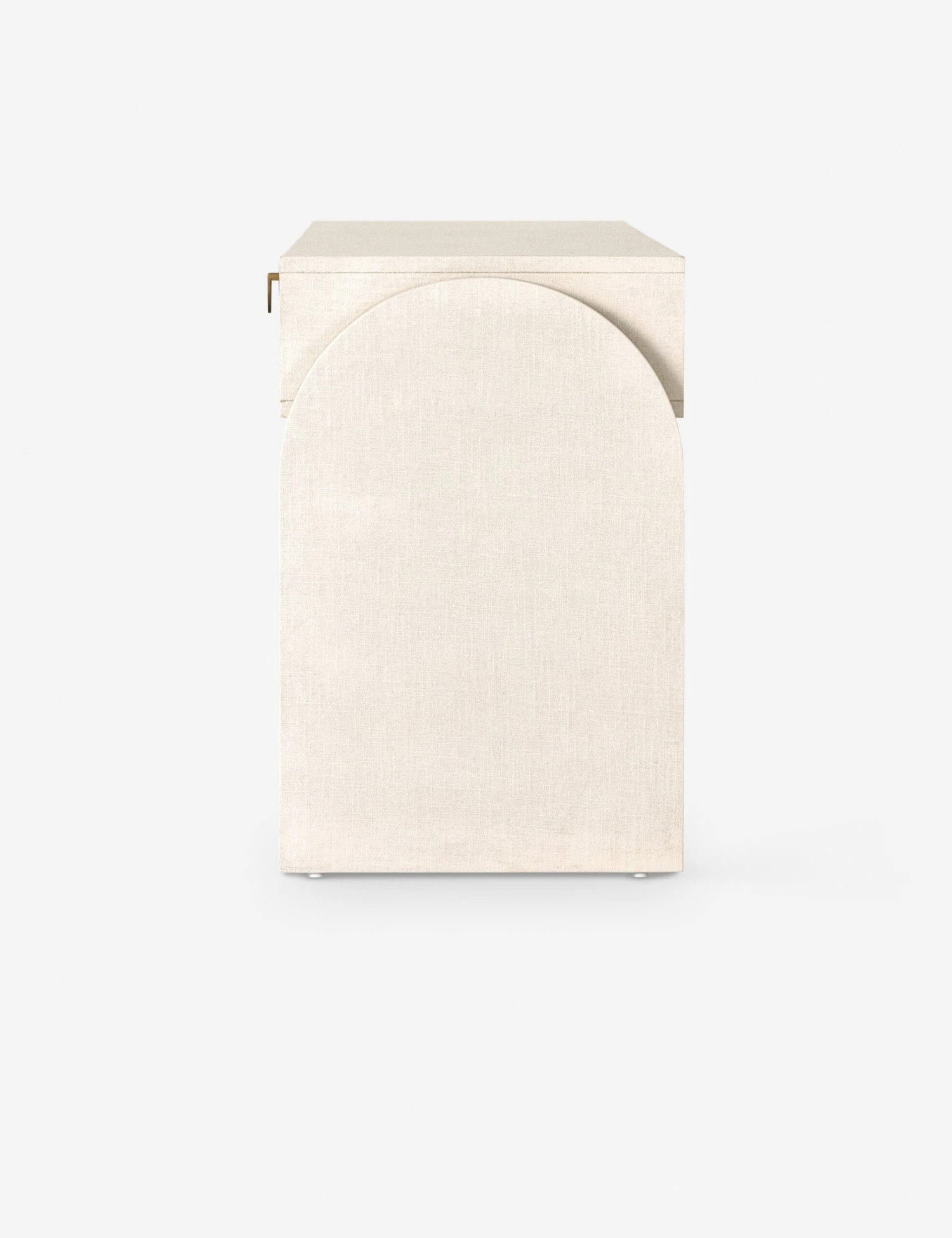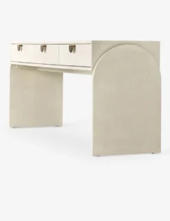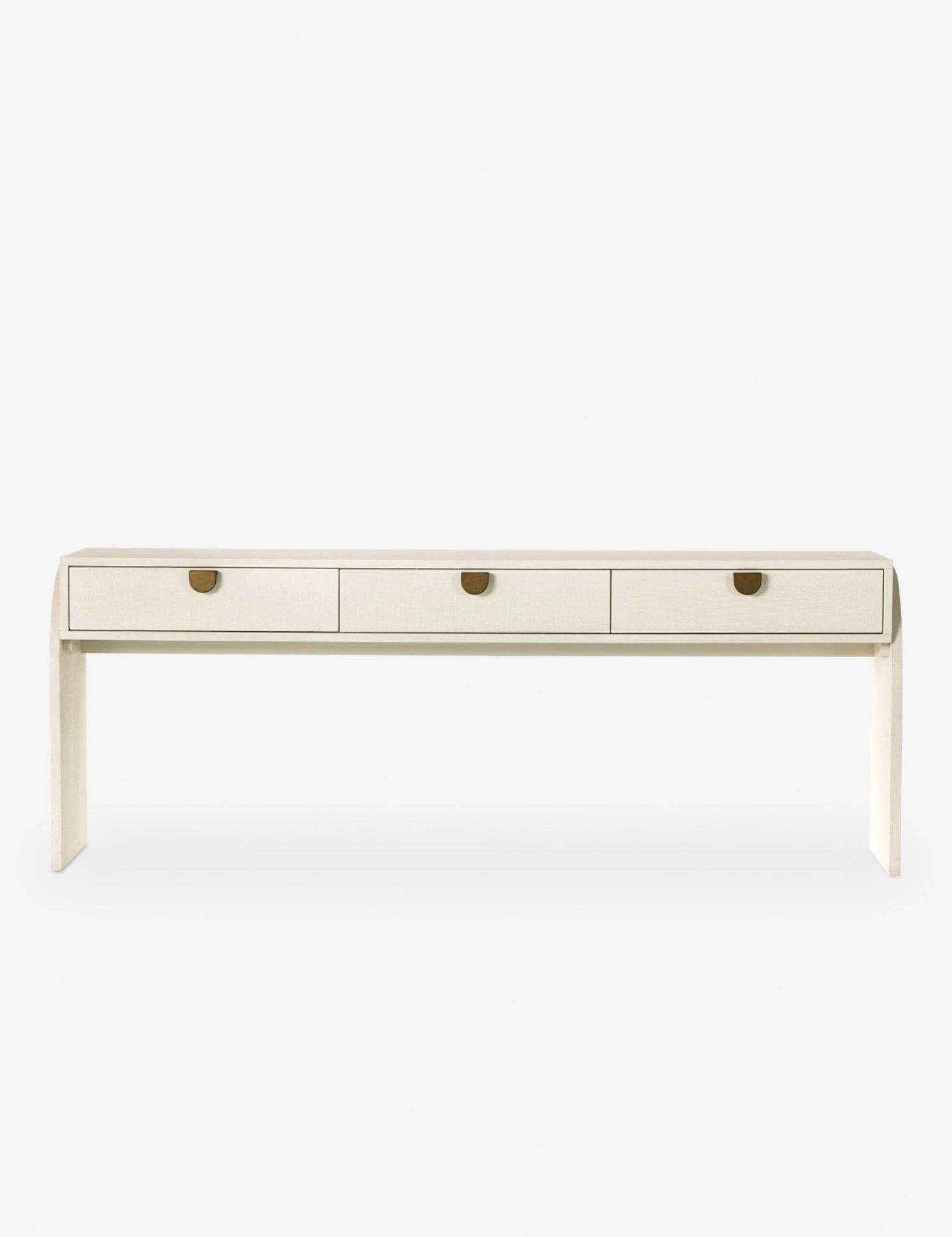 Showstopping design is all about well-chosen feature pieces. Arched legs, half-moon pulls, and a painted linen covering bring endless character to this deco-inspired console table. Three drawers and a spacious top offer practical appeal whether styled as a living room or entryway table.