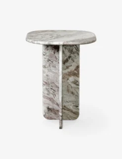 Bring polish to your edit with the Pereda side table. This solid marble end table showcases the natural drama of the stone with a sculptural silhouette that features long slabs forming a T-shaped base. Rounded corners complete the look with soft elegance beside any seat.
