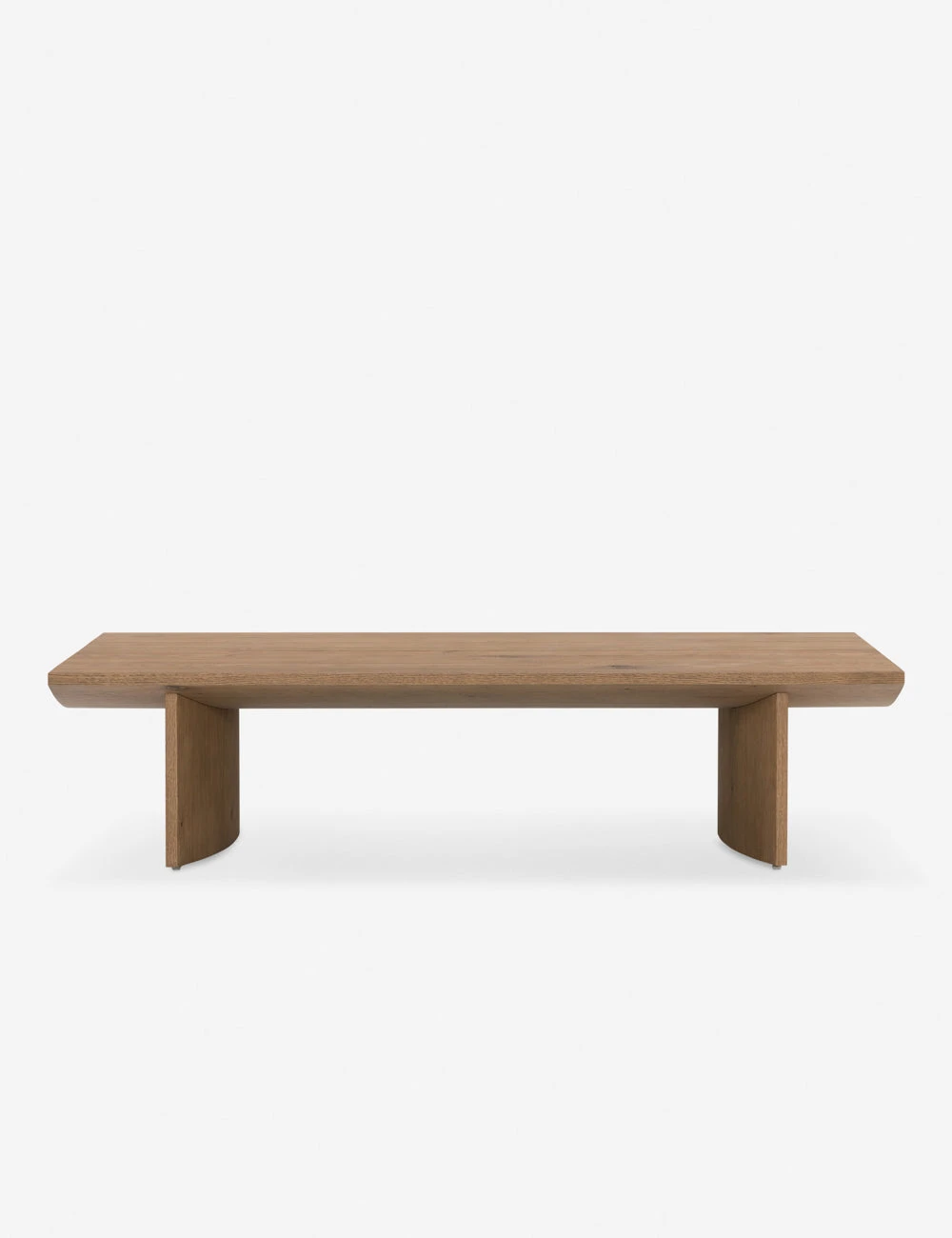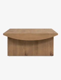 Casting a clean, cut silhouette, this coffee table design is softened by a curved-bottom tabletop sturdily set on two flat, solid legs. Clad in a beautiful oak veneer for natural grain appeal, we love the warm and refined tone this wood coffee table offers to the center of a room.