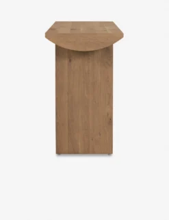 Casting a clean, cut silhouette, this wood console table design is softened by a curved-bottom tabletop sturdily set on two flat, solid legs. Clad in a beautiful oak veneer for natural grain appeal, this hallway table can add a polished touch with organic warmth to your entryway or living space.