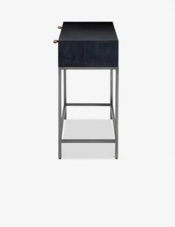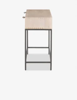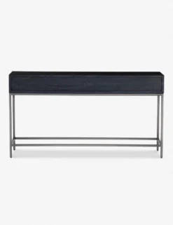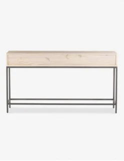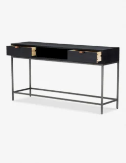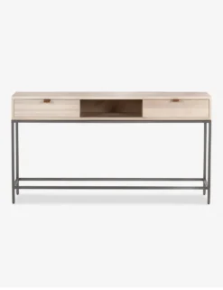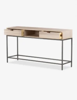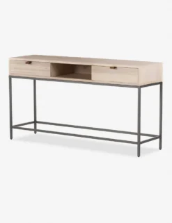 Keep your living space or entry grounded and modern with this sleek console table. With a beautifully essential silhouette, this poplar wood sofa table features elements of mid-century aesthetics like a slim iron base, top-grain leather drawer pulls, and an open shelf for an effortless touch.