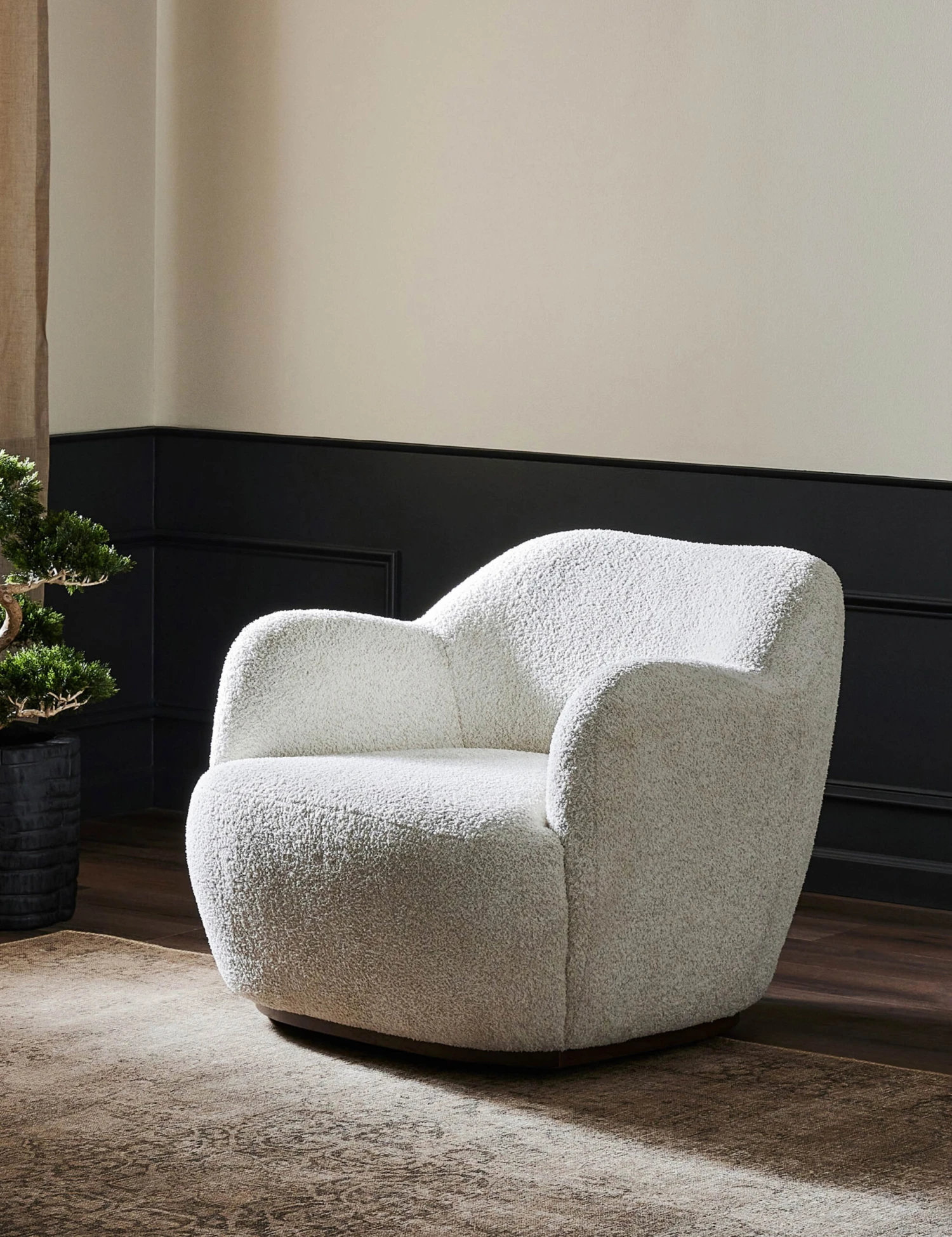 Sculptural lines invite you into the Selkie chair with a contoured seat and soft silhouette. Plush upholstery completes the look with a stylish edge set for seamless comfort. With its swivel base, this modern take on the classic barrel chair is tailor-made for an artfully curated yet livable home design.