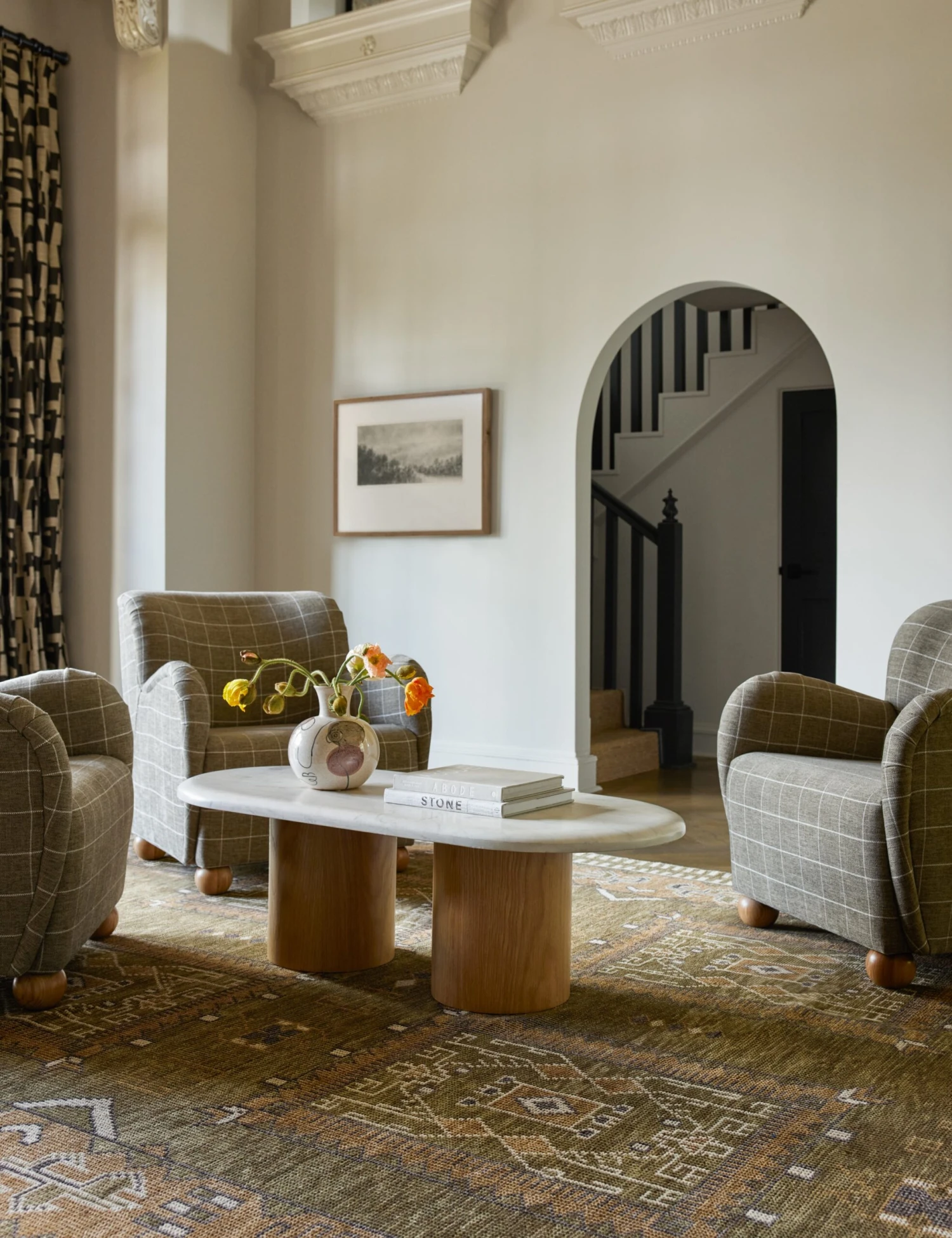 Elegance is in the mix with our Shields coffee table. Two columnar legs clad in oak offer a natural complement to the oval marble top—a spacious surface with no sharp corners, perfect for small-space design.