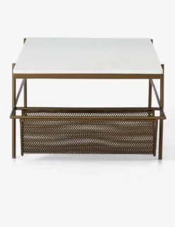 The perfect way to keep your modern style light and fresh, this rectangular coffee table features antique gold hardware, a white marble top, and a mesh lower shelf perfect for storing books or magazines.