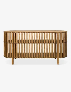 This slatted wood console table is the type of piece that makes you want to take a closer look with its elongated oval frame and edgy nailhead detailing. The two open bottom shelves maximize your entryway table display and storage options, making this a favorite for transitional foyers, dining areas, and living rooms.