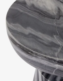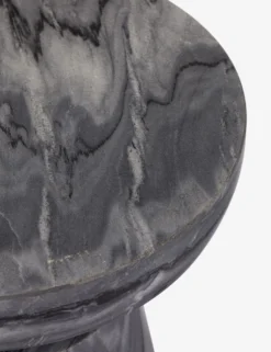 The natural beauty of ebony marble is on full display in this luxe side table. The shape is carved from a single piece of stone and turned on a lathe to form. The weight and visual drama of this piece brings an established feel to the room, whether styled as an end table or a small pedestal for decor.